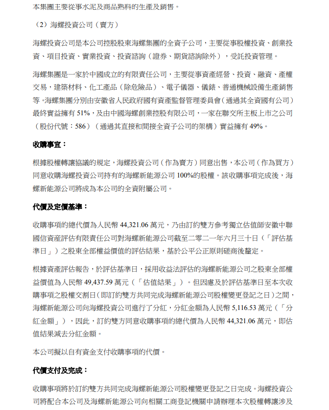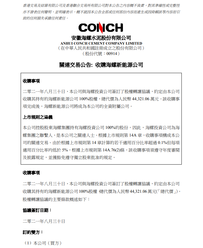 公告中提到,海螺水泥決定收購海螺新能源公司主要基于考慮以下原因及預計可從交易獲得的益處: