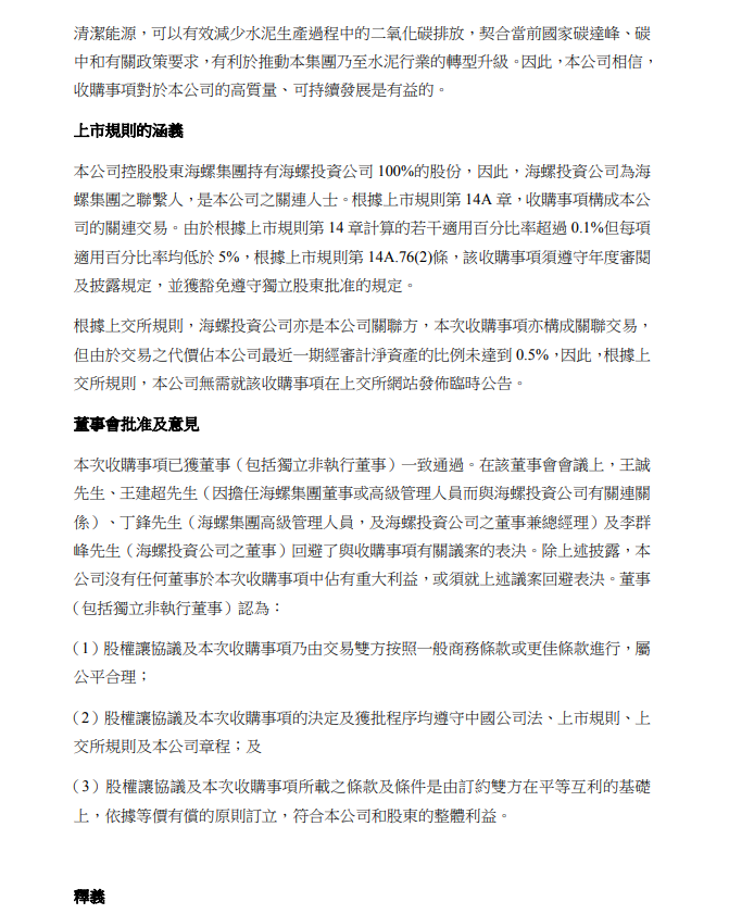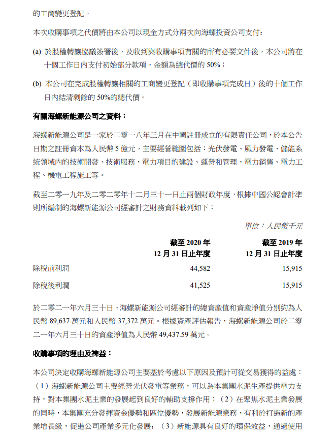 清潔能源,可以有效減少水泥生產過程中的二氧化碳排放,契合當前國家碳達峰、碳 中和有關政策要求,有利於推動本集團乃至水泥行業的轉型升級。因此,本公司相信, 收購事項對於本公司的高質量、可持續發展是有益的。