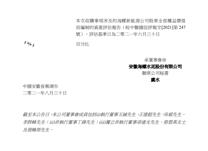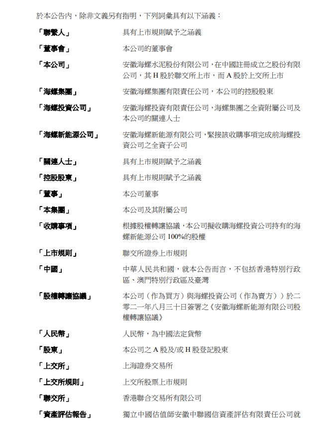 據悉,海螺新能源公司是一家于二零一八年三月在中國注冊成立的有限責任公司,于本公告日期之注冊資本為人民幣5億元,主要經營范圍包括:光伏發電、風力發電、儲能系統領域內的技術開發、技術服務,電力項目的建設、運營和管理,電力銷售、電力工程、機電工程施工等。根據資產評估報告,海螺新能源公司于二零二一年六月三十日的資產凈值為人民幣 49437.59 萬元。