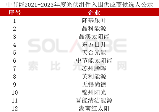 根據中標文件,本次招標共有12家光伏企業(yè)入圍。分別為:隆基樂葉、晶科能源、晶澳太陽能、東方日升、天合光能、中節(jié)能太陽能、蘇州騰暉、英利能源、無錫尚德、錦州陽光、晉能清潔能源、湖南紅太陽。