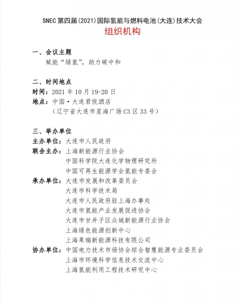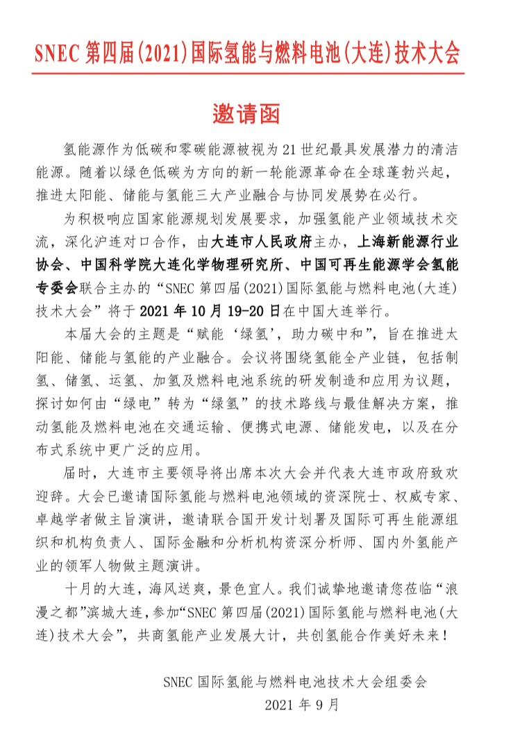 “SNEC 第四屆(2021)國際氫能與燃料電池(大連) 技術大會”將于 2021 年 10 月 19-20 日在中國大連舉行,以下是邀請函內容: