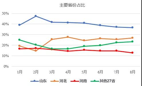 值得注意的是,戶用光伏裝機規(guī)模最大的三個省:山東、河北、河南近4個月的裝機環(huán)比變化不大,因此在全國市場中的占有率持續(xù)走低,如下圖所示。但8月份占比仍高達76.5%。