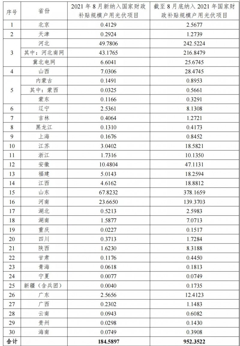 根據(jù)各省級能源主管部門、電網(wǎng)企業(yè)報送信息,經(jīng)國家可再生能源信息管理中心梳理統(tǒng)計,2021年8月新納入國家財政補貼規(guī)模戶用光伏項目總裝機容量為184.59萬千瓦。截至2021年8月底,全國累計納入2021年國家財政補貼規(guī)模戶用光伏項目裝機容量為952.35萬千瓦。詳細情況見附表。