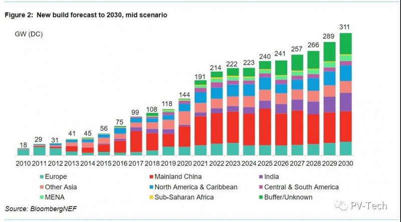 由于部分國家超過了短期預(yù)期,比如中國的太陽能裝機容量會遠超預(yù)期。預(yù)計中國大陸將成為2021年太陽能裝機容量最高的地區(qū),美國則以相當大的距離排在第二位。
