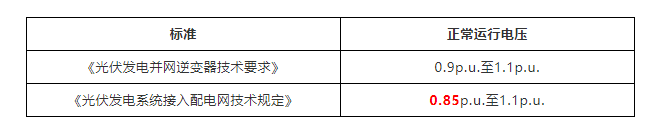《光伏發(fā)電并網(wǎng)逆變器技術(shù)要求》(GB/T37408-2019),規(guī)定A類逆變器在0.9p.u.至1.1p.u.之間應(yīng)能正常運(yùn)行,B類逆變器宜與A類光伏逆變器的要求相同。《光伏發(fā)電系統(tǒng)接入配電網(wǎng)技術(shù)規(guī)定》(GB/T29319-2012),規(guī)定正常運(yùn)行范圍為,0.85p.u.至1.1p.u.之間。