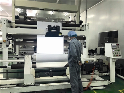 經(jīng)過除塵、穿防護(hù)服等嚴(yán)格程序,記者進(jìn)入福膜新材料科技有限公司的生產(chǎn)車間。生產(chǎn)車間內(nèi)并沒有多少工人,自動化運(yùn)行的生產(chǎn)線經(jīng)過加料、加工等各個環(huán)節(jié),乳白色的薄膜源源不斷地從生產(chǎn)線上出來。