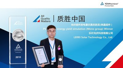 無錫2017年3月14日電 /美通社/ -- TUV萊茵“質勝中國”光伏盛典昨日在無錫拉開帷幕,備受業界關注的2017“質勝中國優勝獎”榜單正式出爐,獲得“質勝中國優勝獎”,即證明該產品擁有卓越的質量。作為最受關注的“光伏組件發電量仿真優勝獎”壓軸發布。在模擬了德國科隆、中國大同、日本熊本、印度金奈、美國洛杉磯五個地區環境,經歷嚴格嚴苛的實測之后,完成了“光伏組件發電量仿真競賽”的發電量測試。最終, 樂葉光伏 60 片單晶組件以實際發電總數據第一的成績獲得單晶組第一名,獲得“ 光伏組件發電量仿真優勝獎 ”單晶唯一獎項;同時也以全部組件中第一名的成績證明了其單晶組件發電能力的先進性。
