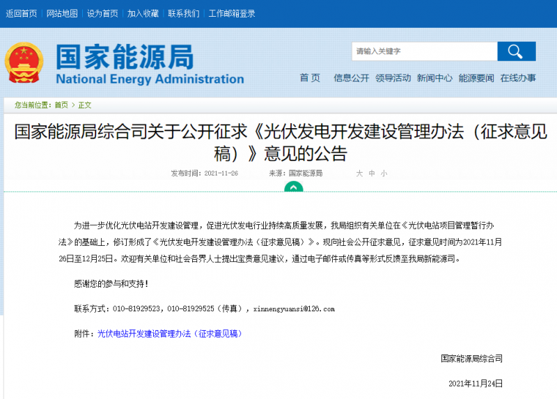 為進一步優化光伏電站開發建設管理,促進光伏發電行業持續高質量發展,我局組織有關單位在《光伏電站項目管理暫行辦法》的基礎上,修訂形成了《光伏發電開發建設管理辦法(征求意見稿)》?,F向社會公開征求意見,征求意見時間為2021年11月26日至12月25日。歡迎有關單位和社會各界人士提出寶貴意見建議,通過電子郵件或傳真等形式反饋至我局新能源司。
