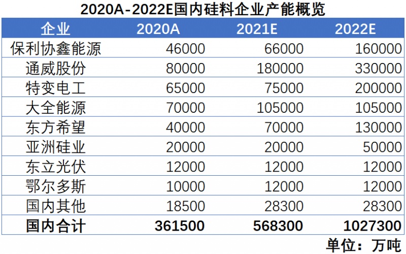 或許是硅料價格的暴漲刺痛了下游企業的神經,抑或是為了自身的供應鏈安全,在硅料企業擴產的同時,下游企業也紛紛開始與硅料企業共建產能。比如上機參與了協鑫的產能擴建,通威與隆基、天合、京運通、上機等企業合資共建等。有了下游企業的資金支持,硅料產能的釋放,也指日可待。