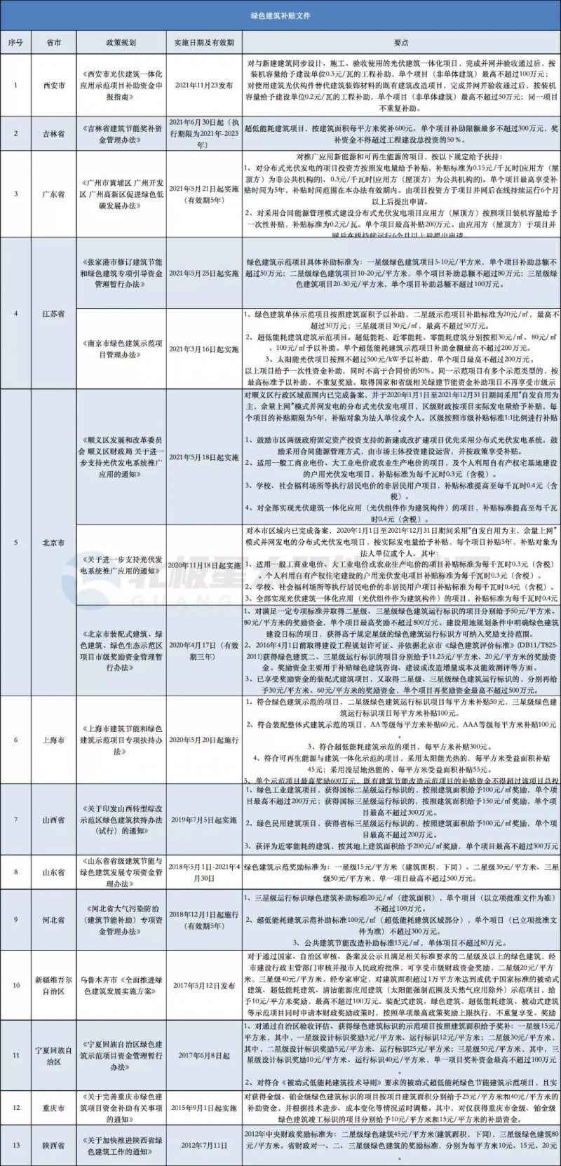 激勵與補貼:在資金補助方面,太陽能光伏項目按照不超過500元/kW予以補助,原則上單個可再生能源建筑應用示范項目補助金額最高不超過200萬元。其他不同項目對應不同補助標準,主要為根據建筑面積分星級進行補助,最高不超過300萬元。