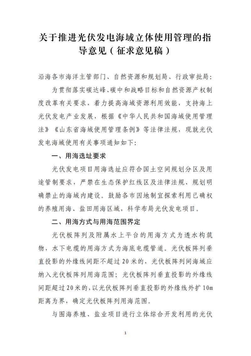 山東省海洋局關于向社會公開征求《關于推進光伏發電海域使用立體確權的指導意見(征求意見稿)》意見的公告