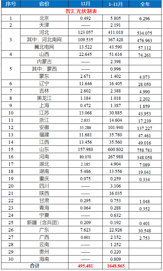 目前,已經有23個省、自治區、直轄市公布了本省12月份的戶用新增數據,這23省總規模為4954.8MW(各省具體數據詳見附件);考慮到剩余8個省的戶用光伏裝機規模,預期12月全國戶用規模約為5GW(應略微大于5GW);