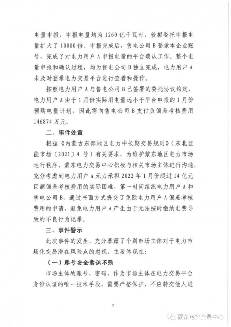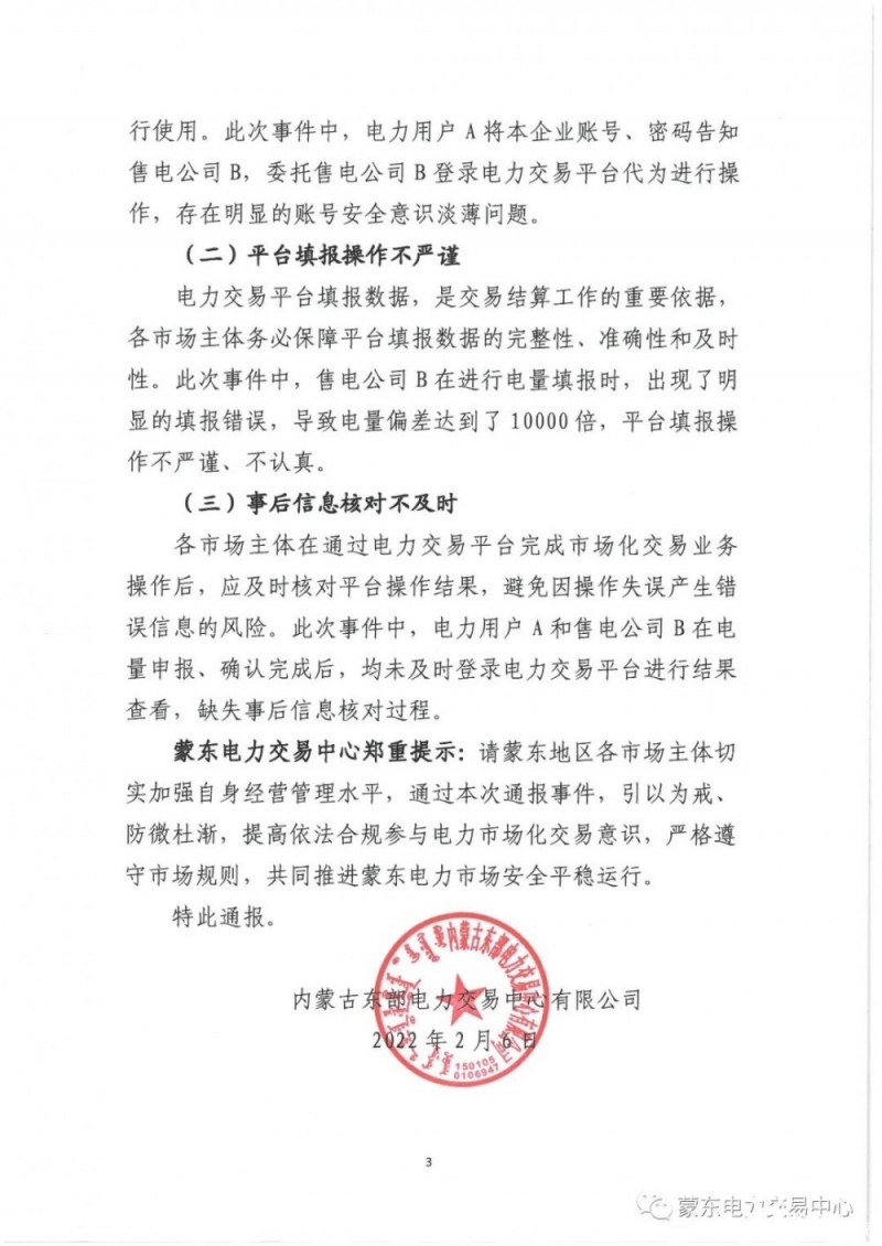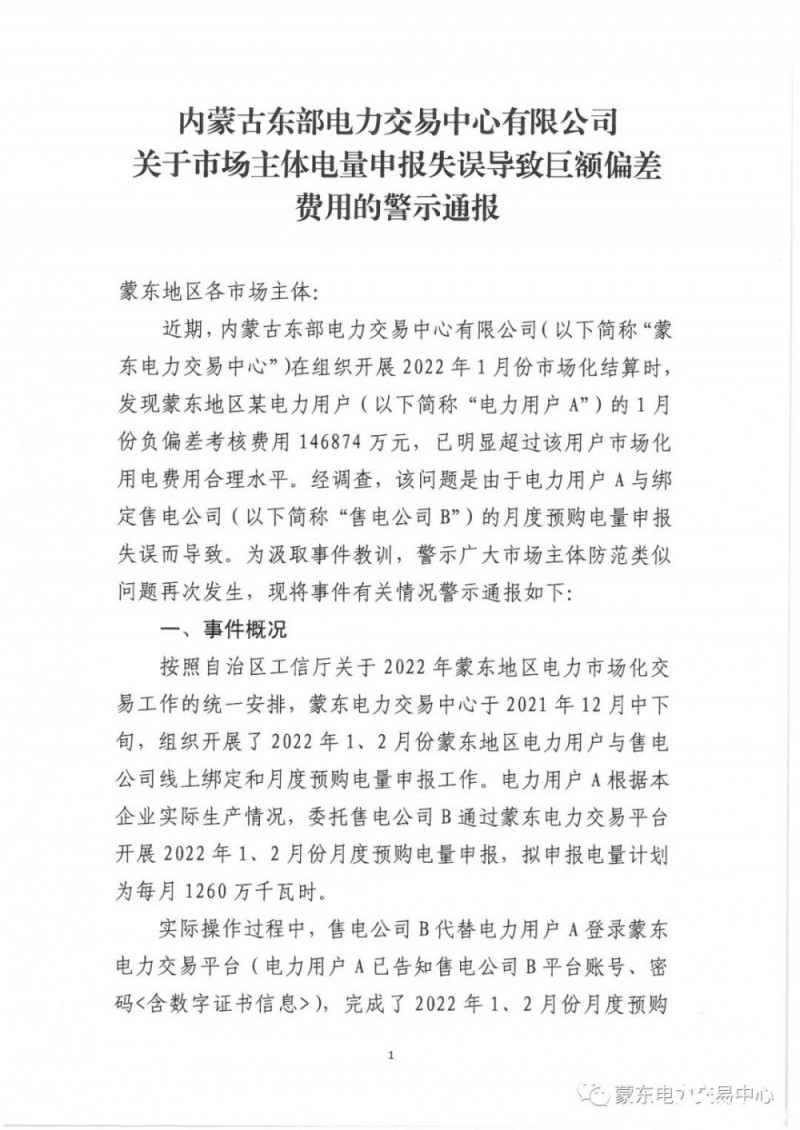 2月6日,內蒙古東部電力交易中心有限公司發布《關于市場主體電量申報失誤導致巨額偏差費用的警示通報》,