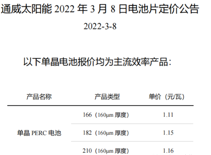 3月8日,電池龍頭通威也于官網(wǎng)宣布了上調(diào)各尺寸電池片報價。