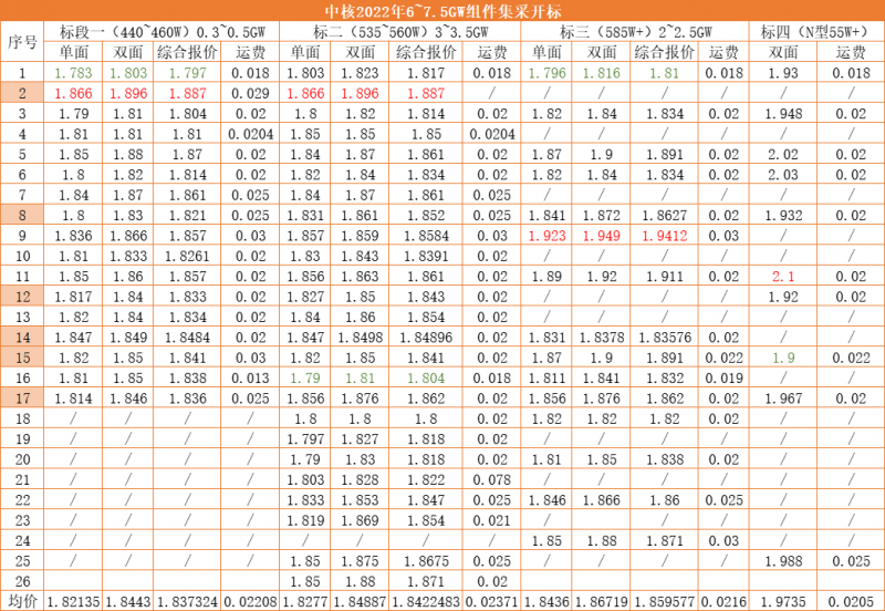 根據開標結果來看,本次報價有單雙面組件的分別報價、綜合報價以及運費,是近期以來報價較為明確且精確的一次開標。從價格方面來看,本次報價的最低價為1.783元/瓦,最高報價則出自N型標段的2.1元/瓦。值得注意的是,某企業N型產品最低報價為1.9元/瓦。
