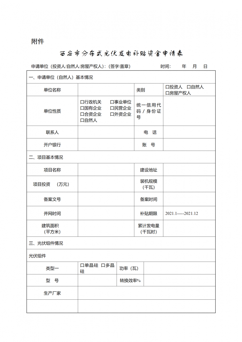 為落實西安市人民政府辦公廳印發《關于促進光伏產業持續健康發展的實施意見的通知》(市政辦發〔2018〕32號)有關要求,根據年度工作安排,現對全市2021年度分布式光伏補貼資金申報工作明確如下: