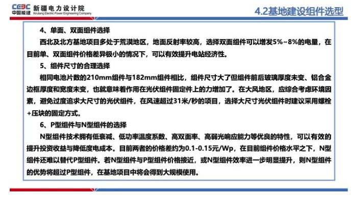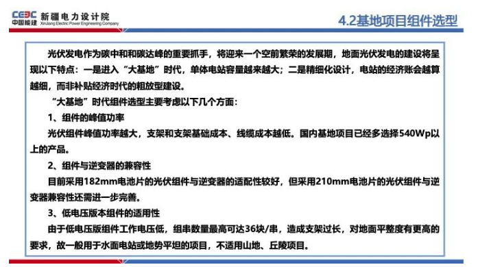 中國能建新疆電力設(shè)計院表示,“大基地”時代組件選型主要考慮以下幾個方面: