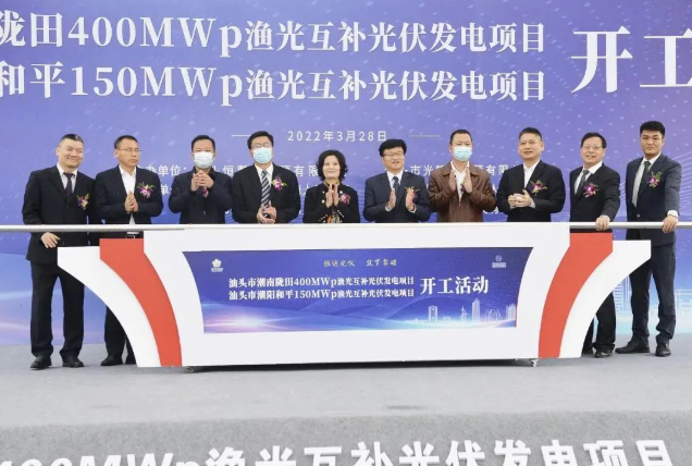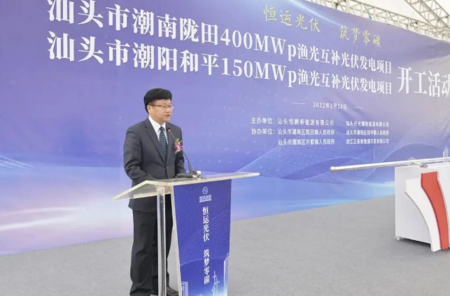 肖立在致辭中表示,在雙碳目標推進的背景下,新能源產業迎來了重大發展機遇。汕頭市發展光伏產業具有得天獨厚的自然優勢。此次開工建設的隴田、和平漁光互補光伏發電項目,聚焦汕頭市構建“三新兩特一大”新發展格局,助力汕頭市加快構建清潔低碳,安全高效的現代能源體系,為區域實現雙碳目標作出重要貢獻。項目總投資約23億元,設計容量550MW,是亞洲最大漁光互補光伏發電項目之一,建成后可累計實現工業產值65億元,累計創造財政稅收約13億元。希望通過汕頭市、區政府和各參建單位的共同努力,將項目建設成為新能源精品樣板工程。