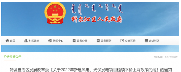 4月18日,科爾沁人民政府轉(zhuǎn)發(fā)由國家發(fā)改委發(fā)布的《關(guān)于2022年新建風電、光伏發(fā)電項目延續(xù)平價上網(wǎng)政策的函》的通知。