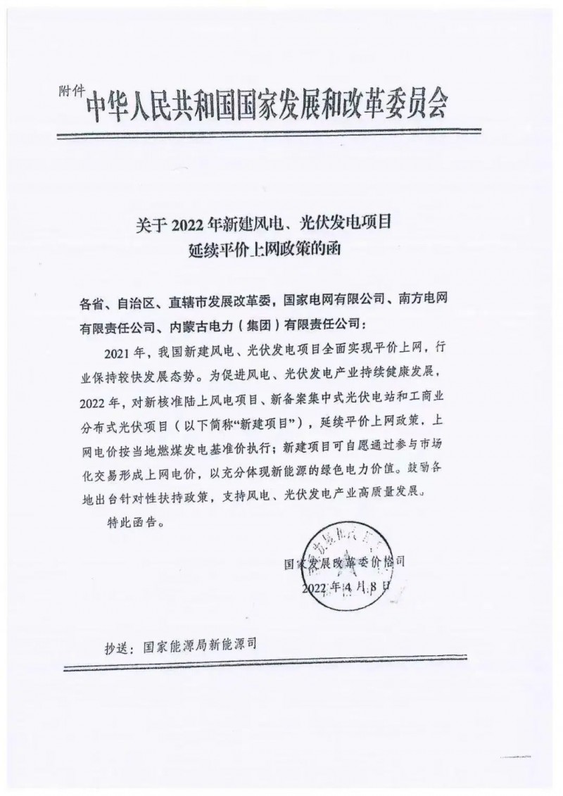 國家發(fā)改委價格司發(fā)布的《關(guān)于2022年新建風電、光伏發(fā)電項目延續(xù)平價上網(wǎng)政策的函》指出,2021年,我國新建風電、光伏發(fā)電項目全面實現(xiàn)平價上網(wǎng),行業(yè)保持較快發(fā)展態(tài)勢。為促進風電、光伏發(fā)電產(chǎn)業(yè)持續(xù)健康發(fā)展,2022年,對新核準陸上風電項目、新備案集中式光伏電站和工商業(yè)分布式光伏項目(以下簡稱“新建項目”),延續(xù)平價上網(wǎng)政策,上網(wǎng)電價按當?shù)厝济喊l(fā)電基準價執(zhí)行。新建項目可自愿通過參與市場化交易形成上網(wǎng)電價,以充分體現(xiàn)新能源的綠色電力價值。鼓勵各地出臺針對性扶持政策,支持風電、光伏發(fā)電產(chǎn)業(yè)高質(zhì)量發(fā)展。