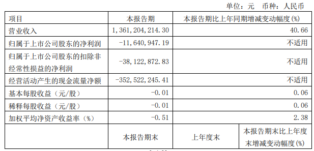 4月26日,億晶光電發布2022年第一季度報告,企業營業收入1,361,204,214.30元,同比增加40.66%,歸屬上市股東凈利潤虧損11,640,947.19元,詳情如下: