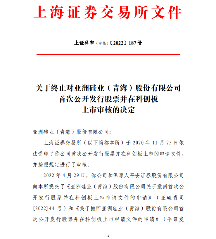 5月1日,上交所披露關于終止對亞洲硅業(青海)股份有限公司首次公開發行股票并在科創板上市審核的決定:4月29日,亞洲硅業(青海)股份有限公司因發行人撤回發行上市申請或者保薦人撤銷保薦。根據規定,上交所終止其發行上市審核。
