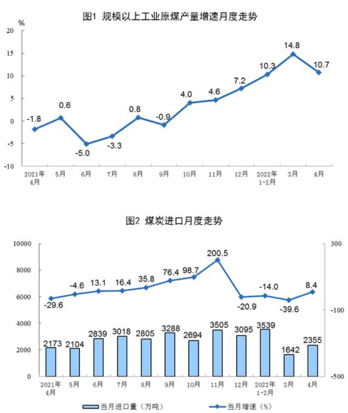 原煤生產較快增長,進口由降轉增。煤炭增產增供政策持續推進,原煤生產保持較快增長。4月份,生產原煤3.6億噸,同比增長10.7%,增速比上月放緩4.1個百分點,日均產量1209萬噸。進口煤炭2355萬噸,同比增長8.4%,上月為下降39.6%。
