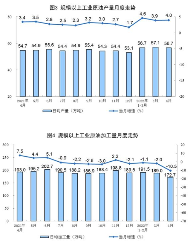 原油生產穩定增長,進口由降轉增。4月份,生產原油1700萬噸,同比增長4.0%,增速比上月加快0.1個百分點,日均產量56.7萬噸。進口原油4303萬噸,同比增長6.6%,上月為下降14.0%。
