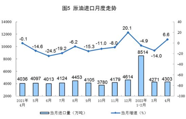 1—4月份,生產原油6819萬噸,同比增長4.3%。進口原油17089萬噸,同比下降4.8%。