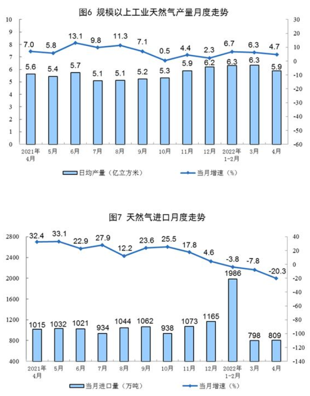 天然氣生產保持平穩,進口降幅擴大。4月份,生產天然氣177億立方米,同比增長4.7%,增速比上月放緩1.6個百分點,日均產量5.9億立方米。進口天然氣809萬噸,同比下降20.3%,降幅比上月擴大12.5個百分點。