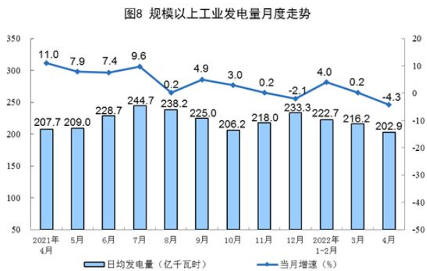 電力生產由增轉降。4月份,發電6086億千瓦時,同比下降4.3%,上月為增長0.2%,日均發電202.9億千瓦時。1—4月份,發電2.6萬億千瓦時,同比增長1.3%。