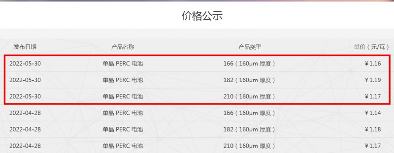 5月30日,通威太陽能發布單晶PERC電池片最新報價,其中,M6電池片價格上調0.02元/W至1.16元/W,M10電池片價格上調0.01元/W至1.19元/W,G12電池片價格維穩,保持1.17元/W未變。