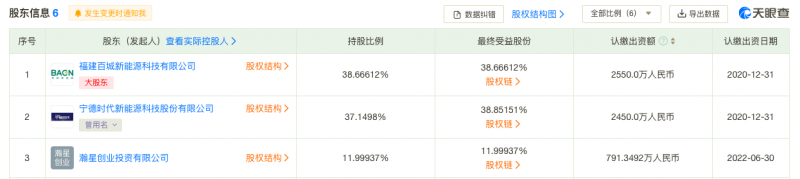最新股權信息顯示,百城新能源系上海快卜第一大股東,持股比例約為38.67%,略高于寧德時代。寧德時代為第二大股東,持股比例約為37.15%。最新入股的瀚星投資持股比例約為12.00%,位列第三大股東。