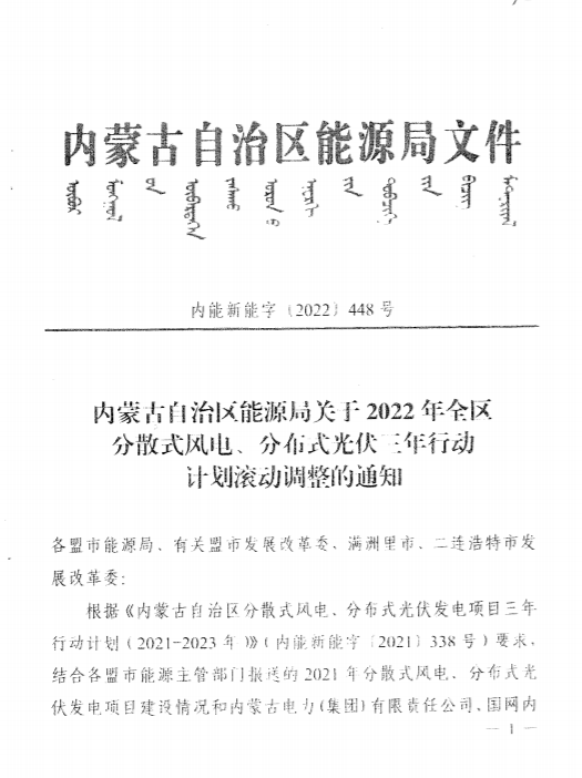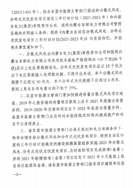 1)加快推進存量分散式風電、分布式光伏項目建設、2019年之前安排的存量項目原則上應用2021年底前全容量并網、各盟市能源主管部門應及時對未能按照規定時限內建成投產的項目予以清理廢止。