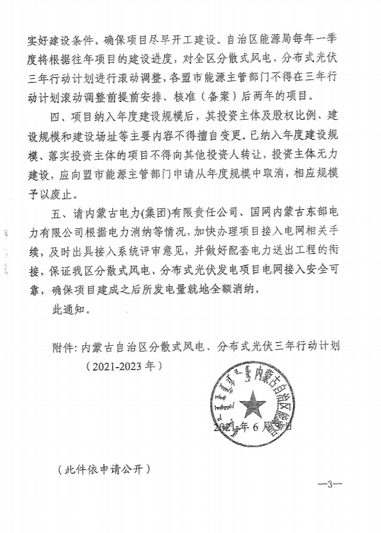 3)在當年建設計劃規模內的分散式風電、分布式光伏發電項目必須于當年核準、備案并開工建設,分散式風電項目必須于次年12月底建成并網,分布式光伏發電項目必須于次年6月底建成并網,對于未按規定時間并網的項目,各盟市能源主管部門應及時予以廢止。