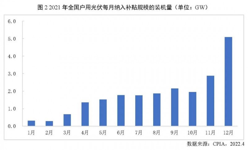 2021年全國戶用光伏市場基本呈現每月增長的趨勢,并且下半年快速增長。1-3月,由于2021年光伏發電政策尚未下發,同時趕上農歷春節,戶用光伏市場處于傳統的冷淡期,每月新增規模在1GW以下;4月份開始,能源局、國家發展改革委先后發出有關光伏發電項目規模管理和度電補貼價格的政策征求意見稿,全國各地戶用光伏市場在利好政策的帶動下開始快速恢復,每月新增規模超過1GW;下半年,全國戶用光伏市場繼續保持迅猛發展勢頭,單月新增裝機規模陸續突破2GW,尤其是12月份,單月新增裝機規模達到5.09GW,創歷史新高。值得一提的是,截至11月底,全國戶用光伏新增裝機達到16.5GW,根據“一個月緩沖期”的要求,2021年享受補貼的戶用光伏項目并網截止時間為12月31日,即2021年安裝并網的戶用光伏項目全可享受補貼,在戶用光伏單獨管理后,并網截止時間首次持續到年底。2021年全國戶用光伏每月納入補貼規模的安裝量如下圖所示。