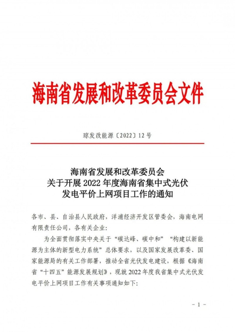 附件:1、《海南省發展和改革委員會關于開展2022年度海南省集中式光伏發電平價上網項目工作的通知》(瓊發改能源〔2022〕12號)