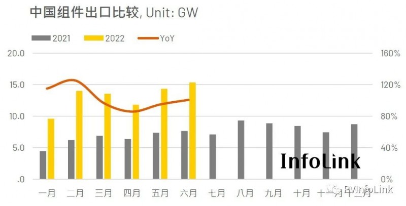 歐洲為2022上半年進口組件最為火熱的市場,目前已累計從中國進口了42.4 GW的光伏組件,同比成長來到了137%,且呈現逐月增長的態勢。