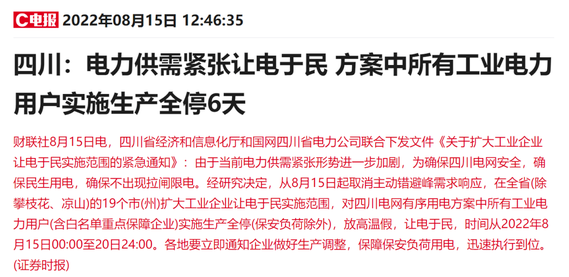 聯(lián)系到8月15日,四川省經(jīng)濟(jì)和信息化廳和國(guó)網(wǎng)四川省電力公司聯(lián)合下發(fā)文件《關(guān)于擴(kuò)大工業(yè)企業(yè)讓電于民實(shí)施范圍的緊急通知》,要求對(duì)四川電網(wǎng)有序用電方案中所有工業(yè)電力用戶(含白名單重點(diǎn)保障企業(yè))實(shí)施生產(chǎn)全停(保安負(fù)荷除外),放高溫假,讓電于民。