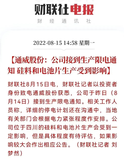 四川乃光伏制造重地,硅料、電池片等產(chǎn)能集聚。此前也有報(bào)道稱,四川省發(fā)布新一輪限電通知,受此影響,四川地區(qū)硅料、硅片及電池片企業(yè)全部停產(chǎn)停工。
