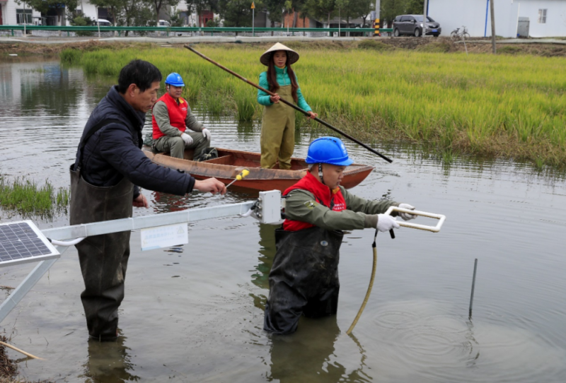 湖北潛江供電公司工作人員在蝦田安裝水質監測設備