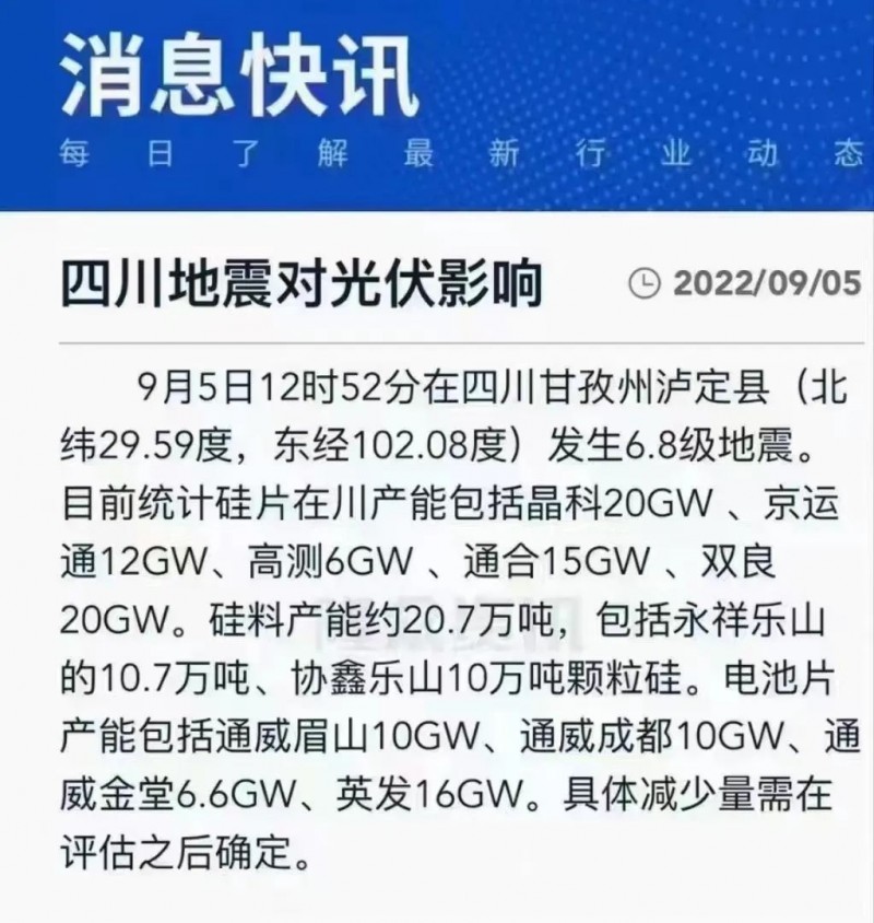 光伏方面,據了解,目前地震對四川地區(qū)硅料及電池片影響較為有限,對當地硅片生產影響相對較大,主要是由于硅片生產在拉棒環(huán)節(jié)對硅棒的垂直度要求較高,廠區(qū)的震感會導致爐料及硅棒的晃動,從而導致斷棒,目前對當地生產具體影響還在評估中。