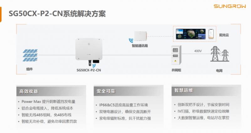 光伏產業的發展離不開創新的智慧方案,陽光電源渠道解決方案高級經理賀金印帶來《陽光電源分布式解決方案》主題演講,首先介紹了陽光電源品牌的發展歷程及布局光伏逆變器、儲能變流及儲能系統等十大業務領域的技術創新成果。另外,他指出,在雙碳目標背景下,分布式光伏面臨著收益下降、安全風險、運維困難等問題,針對這些問題,陽光電源提出了SG50CX系統解決方案。