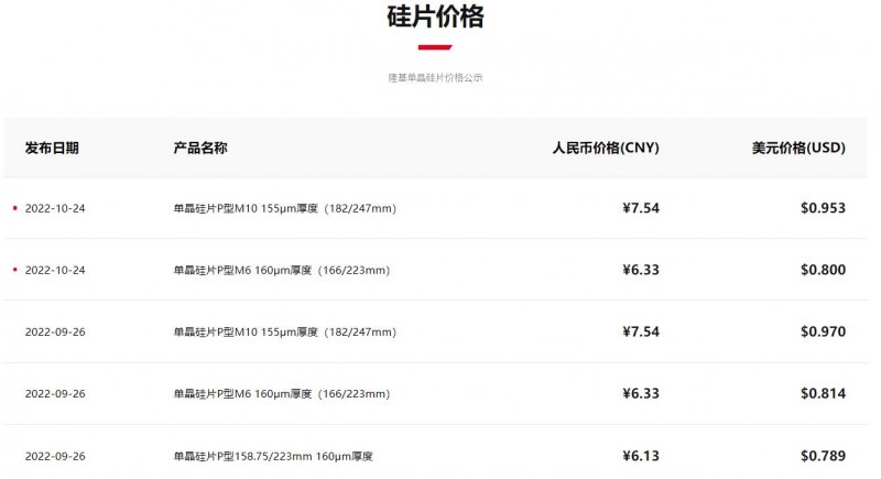 10月24日,隆基發布最新單晶硅片價格公示,與上次(9月26日)報價相比,M10、M6硅片價格未變,分別為7.54元/片、6.33元/片;G1單晶硅片報價取消,該規格上次報價為6.13元/片。