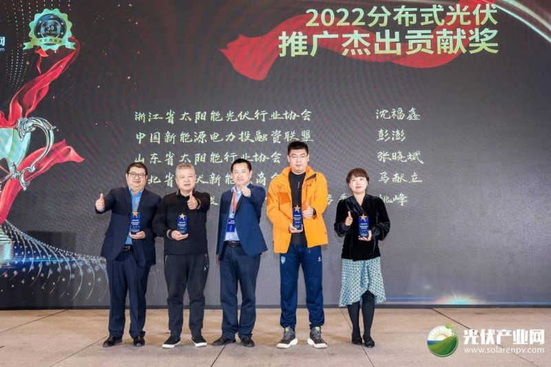 晚會最后還特別給浙江省太陽能光伏行業協會沈福鑫、中國新能源電力投融資聯盟彭澎、山東省太陽能行業協會張曉斌、河北省光伏新能源商會馬獻立、河南省產業發展研究會新能源專委會姚峰頒發了2022分布式光伏推廣杰出貢獻獎。