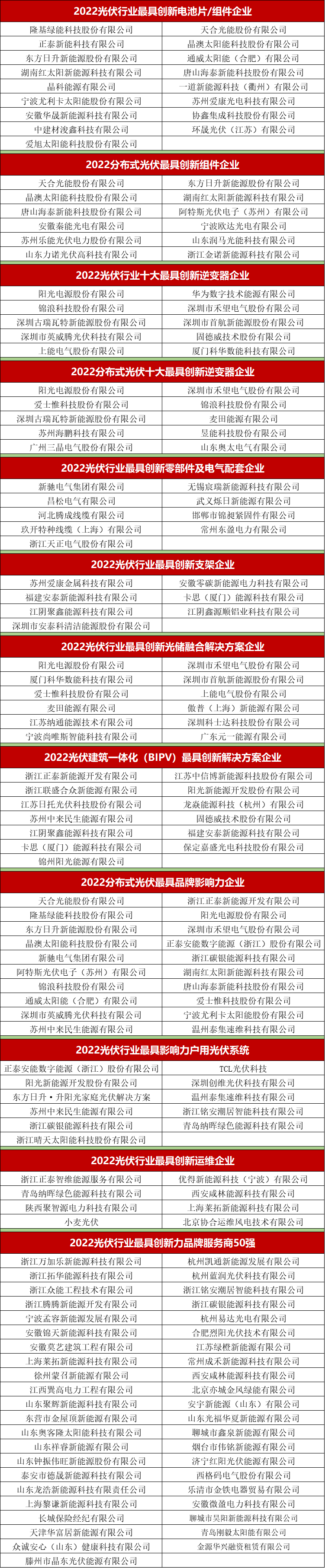 「PV TOP 50」2022光伏創新榜除了發布“2022光伏行業最具創新力品牌服務商50強”榜單,同時也評選出了“2022光伏行業最具創新電池片/組件企業”、“2022分布式光伏最具創新組件企業”、“2022光伏行業十大最具創新逆變器企業”、“2022分布式光伏十大最具創新逆變器企業”、“2022光伏行業最具創新零部件及電氣配套企業”、“2022光伏行業最具創新支架企業”、“2022光伏行業最具創新光儲融合解決方案企業”、“2022光伏建筑一體化(BIPV)最具創新解決方案企業”、“2022分布式光伏最具品牌影響力企業”、“2022光伏行業最具影響力戶用光伏系統”、“2022光伏行業最具創新運維企業”等十一大創新獎項。
