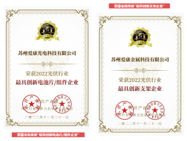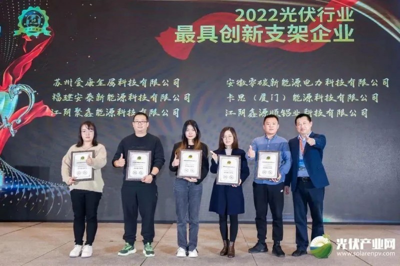 11月21日,2022第七屆光伏創(chuàng)新大會(PVIC2022)暨“PV TOP 50”2022光伏創(chuàng)新榜頒獎典禮在浙江杭州湖皇冠假日酒店隆重召開。愛康憑借行業(yè)領(lǐng)先的研發(fā)能力和創(chuàng)新水平,榮獲2022光伏行業(yè)“最具創(chuàng)新電池片/組件企業(yè)”和“最具創(chuàng)新支架企業(yè)”兩項業(yè)內(nèi)重量級品牌大獎,綜合實力、創(chuàng)新力和競爭力再度得到業(yè)界權(quán)威認可。