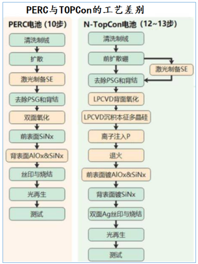從理論上講,將原有的PERC產線改造升級為現在的TOPCon產線,只需要新增三道工序,刪掉原有兩道工序,調整原有一道工序,但這只是對老產線最大程度保留下的TOPCon產線最基本配置。從下圖我們來看一下標準的PERC產線和TOPCon產線的差異: