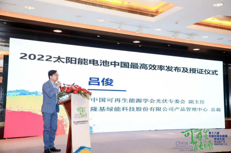 中國可再生能源學(xué)會光伏專委會副主任、隆基綠能產(chǎn)品管理中心總裁呂俊博士進(jìn)行《2022太陽電池中國最高效率》發(fā)布。