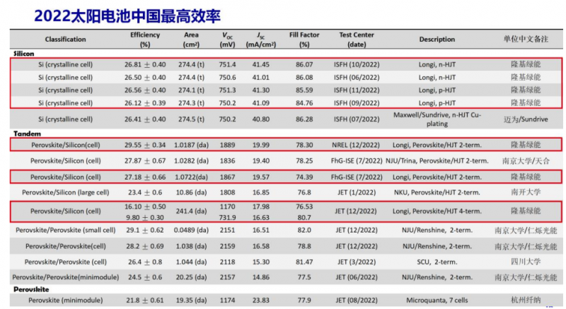2022太陽電池中國最高效率發(fā)布,隆基綠能共有7個電池效率入選,占此次效率結(jié)果發(fā)布的近1/2。